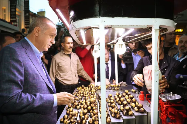 İstiklal Caddesi'nde tramvaydan inen Erdoğan, bir seyyar satıcıdan kestane aldı. Kestaneciyle pazarlık eden Erdoğan, "İşler nasıl?" diye soru. Satıcı da "Elhamdülillah güzel." karşılığını verdi.