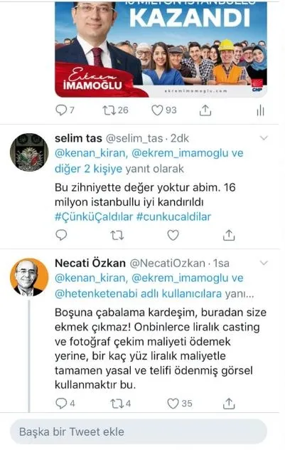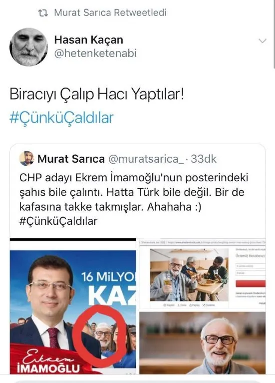Şaibelerle dolu bir seçimin ardından İBB koltuğunu gasp etmeye çalışan Ekrem İmamoğlu'nun seçim sonrası hazırlattığı afişte yer verdiği takkeli ve başörtülü şahısların da çalıntı olduğu ortaya çıktı. İmamoğlu'nun posterinde bulunan sakallı takkeli şahsın, bira reklam çekimlerinde oynayan yabancı bir kişi olduğunu belgeleyen fotoğraflar sosyal medyada yayıldı. Afişi hazırlayan Öykü Reklam Ajansı'nın kurucusu Necati Özkan'dan ise skandal bir açıklama geldi.
