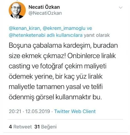 Sabah Gazetesi muhabiri Kenan Kıran'ın skandal yalana ilişkin attığı tepki tweetinin ardından ise, Öykü Reklam Ajansı'nın kurucusu Necati Özkan bir açıklamada bulundu.