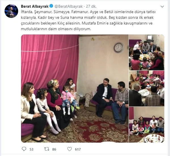 Hazine ve Maliye Bakanı Berat Albayrak, bu akşam iftarda bir aileye misafir oldu. Albayrak, "Beş kızdan sonra ilk erkek çocuklarını bekleyen Kılıç ailesinin, Mustafa Emin'e sağlıkla kavuşmalarını ve mutluluklarının daim olmasını diliyorum" ifadesini kullandı.