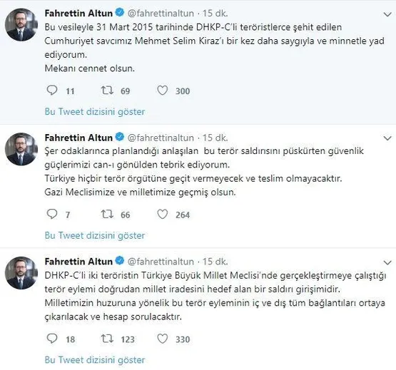 Cumhurbaşkanlığı İletişim Başkanı Fahrettin Altun, iki DHKP-C'li teröristin TBMM'ye yönelik saldırı girişimine ilişkin Twitter'dan açıklamalarda bulundu.