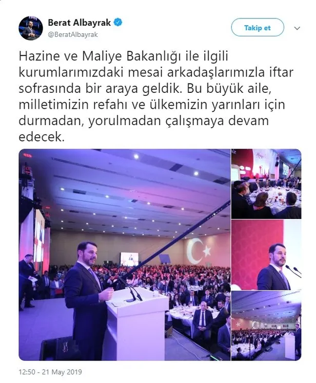 Bakan Albayrak, Twitter'dan yaptığı paylaşımda, "Hazine ve Maliye Bakanlığı ile ilgili kurumlarımızdaki mesai arkadaşlarımızla iftar sofrasında bir araya geldik.