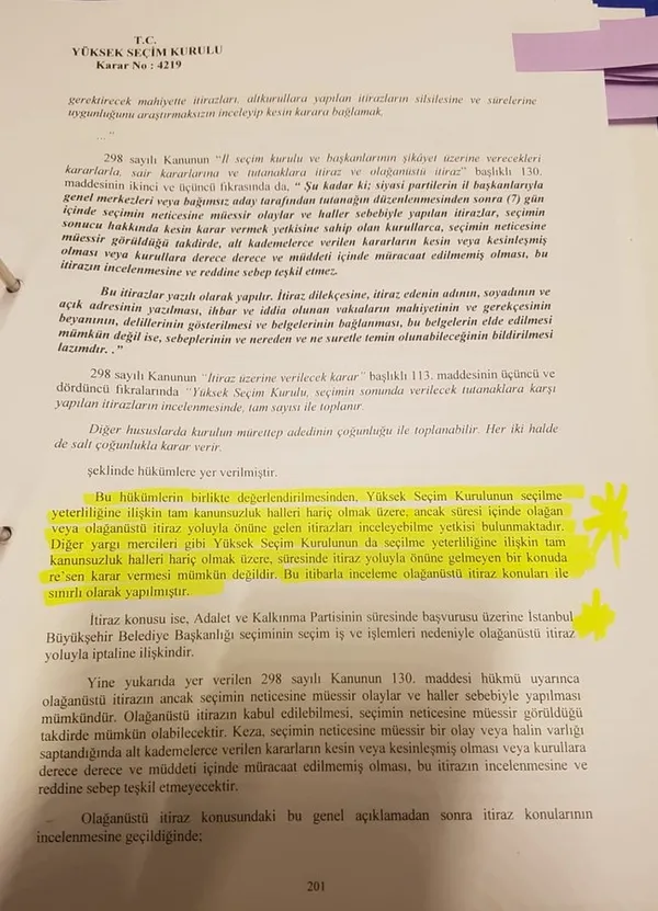 "Kararda; 298 sayılı Kanunun 130. maddesi hükmü uyarınca olağanüstü itirazın ancak seçimin neticesine müessir olaylar ve haller sebebiyle yapılmasıyla mümkün olduğu belirtilerek, "Olağanüstü itirazın kabul edilebilmesi, seçimin neticesine müessir görüldüğü takdirde mümkün olabilecektir. Keza, seçimin neticesine müessir bir olay veya halin varlığı saptandığında alt kademelerce verilen kararların kesin veya kesinleşmiş olması veya kurullara derece derece ve müddeti içinde müracaat edilmemiş olması, bu itirazın incelenmesine ve reddine sebep teşkil etmeyecektir" denildi.