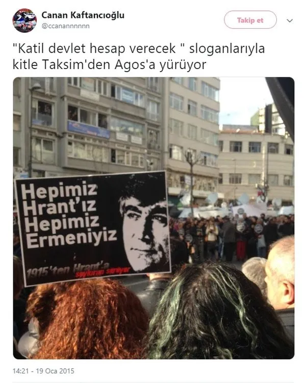 CHP İl Başkanı'nın skandal tweetleri aslında Türkiye Cumhuriyeti Anayasal Organlarını savunmaya yönelik attığı şeklindeki savunması garipsendi. "Katil Devlet hesap verecek sloganlarıyla kitle Taksim'e, Agos'a yürüyor" şeklindeki paylaşımı kabul eden Canan Kaftancıoğlu, bu skandal mesaj için şu savunmayı yaptı: "Yapılan bir yürüyüş esnasında söylenen sloganların, yani mevcut bir durumun Twitter'da paylaşılmasından ibarettir. Bunun benzeri başkaca paylaşımlar vardır."