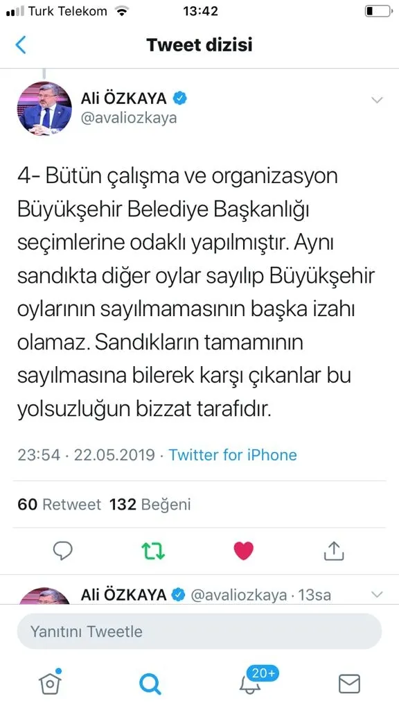 "Bütün çalışma ve organizasyon Büyükşehir Belediye Başkanlığı seçimlerine odaklı yapılmıştır. Aynı sandıkta diğer oylar sayılıp Büyükşehir oylarının sayılmamasının başka izahı olamaz. Sandıkların tamamının sayılmasına bilerek karşı çıkanlar bu yolsuzluğun bizzat tarafıdır."