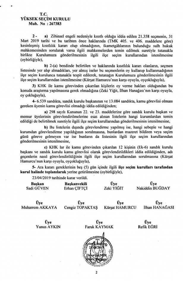 Ara karar gereklerinin beş gün içinde ilgili ilçe seçim kurulları tarafından kurul halinde toplanılarak yerine getirilmesine oy birliğine karar verildi."
