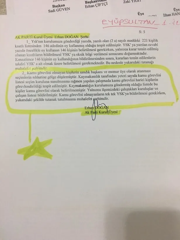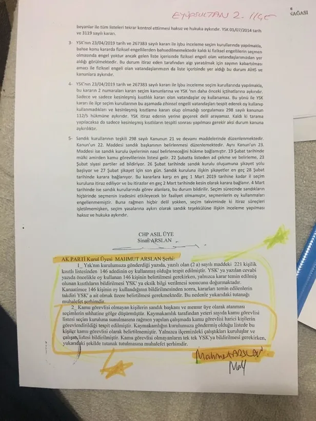 AK Parti Eyüpsultan 2. İlçe Seçim Kurulu üyesi Mahmut Arslan, Eyüp 2. İlçe Seçim Kurulu'nun kararına muhalefet şerhi koydu.