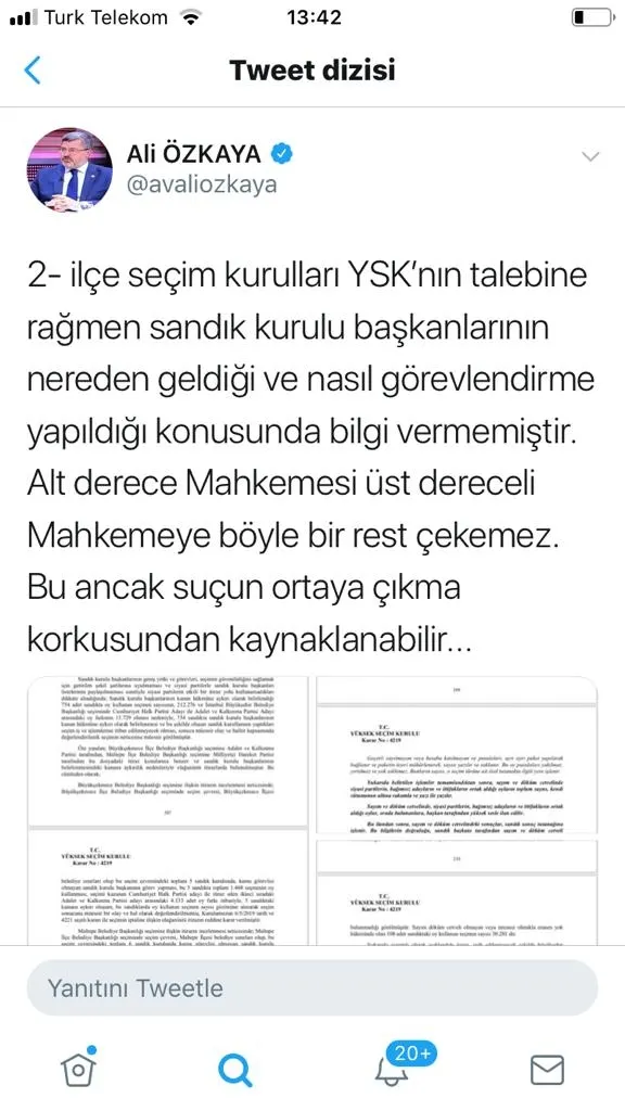 Özkaya, sosyal paylaşım sitesi Twitter'daki şahsi hesabından açıklamada bulundu. Özkaya, ilçe seçim kurulları YSK'nın talebine rağmen sandık kurulu başkanlarının nereden geldiği ve nasıl görevlendirme yapıldığı konusunda bilgi vermediğini belirterek, "Alt derece mahkemesi üst dereceli mahkemeye böyle bir rest çekemez. Bu ancak suçun ortaya çıkma korkusundan kaynaklanabilir..." ifadelerini kullandı.