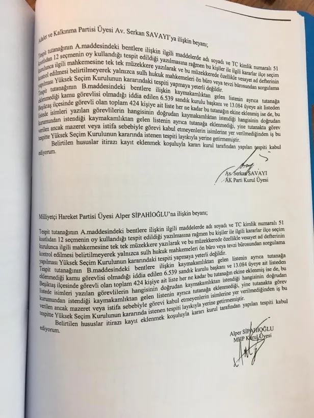MHP Beşiktaş İlçe Seçim Kurulu üyesi Alper Sipahioğlu da, kaymakamlıktan gelen listenin tutanağa konulmadan YSK'ya gönderildiğini ifade etti.