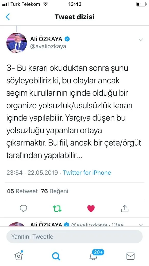 "Yüksek Seçim Kurulu'nun (YSK), İstanbul Büyükşehir Belediye Başkanlığı seçiminin iptaline gerekçeli kararını okuduktan sonra şunu söyleyebiliriz ki, bu olaylar ancak seçim kurullarının içinde olduğu bir organize yolsuzluk/usulsüzlük kararı içinde yapılabilir. Yargıya düşen bu yolsuzluğu yapanları ortaya çıkarmaktır. Bu fiil, ancak bir çete/örgüt tarafından yapılabilir...