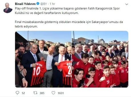 Binali Yıldırım, Spor Toto 1.Ligi'ne yükselme başarısı gösteren Fatih Karagümrük'le ilgili de paylaşımda bulundu.