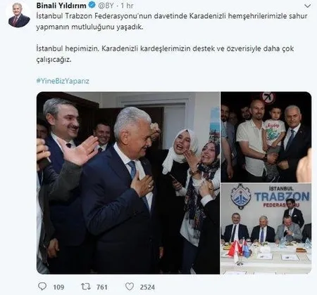 Binali Yıldırım paylaşımında şu ifadeleri kullandı: İstanbul Trabzon Federasyonu'nun davetinde Karadenizli hemşehrilerimizle sahur yapmanın mutluluğunu yaşadık. İstanbul hepimizin, Karadenizli kardeşlerimizin destek ve özverisiyle daha çok çalışıcağız.