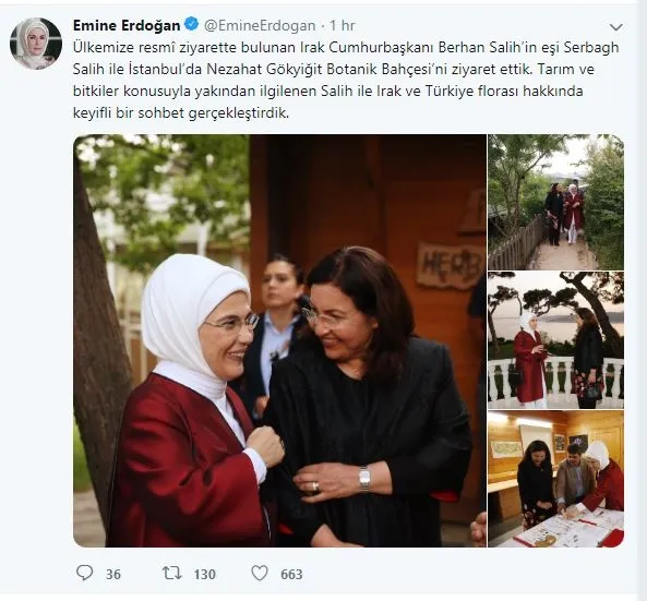 Başkan Recep Tayyip Erdoğan'ın eşi Emine Erdoğan, "Ülkemize resmi ziyarette bulunan Irak Cumhurbaşkanı Berhan Salih'in eşi Serbagh Salih ile İstanbul'da Nezahat Gökyiğit Botanik Bahçesi'ni ziyaret ettik. Tarım ve bitkiler konusuyla yakından ilgilenen Salih ile Irak ve Türkiye florası hakkında keyifli bir sohbet gerçekleştirdik" dedi.