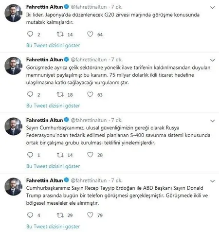 "İki lider, ortak olarak paylaşılan (iki ülke arasındaki) ticareti artırma arzusu, Başkan'ın Türkiye'den alınan çeliğe uygulanan gümrük vergisini yüzde 50'den yüzde 25'e indirme kararı, Türkiye'nin planlanmış S-400 füze savunma sistemi satın alma süreci ve gelecek ay Japonya'nın Osaka kentindeki G20 Zirvesi'nde görüşmelere devam etme imkanı da dahil ikili ilişkileri ele aldı."