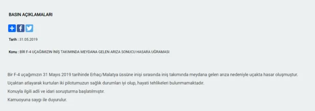 Açıklamada, "Bir F-4 uçağımızın 31 Mayıs 2019 tarihinde Erhaç/Malatya üssüne inişi sırasında iniş takımında meydana gelen arıza nedeniyle uçakta hasar oluşmuştur. Uçaktan atlayarak kurtulan iki pilotumuzun sağlık durumları iyi olup, hayati tehlikeleri bulunmamaktadır. Konuyla ilgili adli ve idari soruşturma başlatılmıştır." denildi.