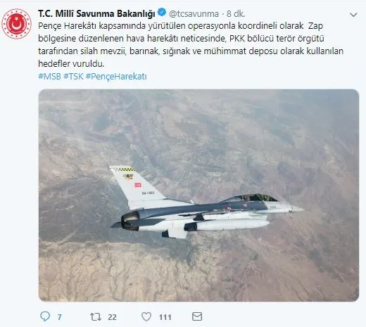 Bakanlığın Twitter hesabından yapılan açıklamada, "Pençe Harekâtı kapsamında yürütülen operasyonla koordineli olarak Zap bölgesine düzenlenen hava harekâtı neticesinde, PKK bölücü terör örgütü tarafından silah mevzii, barınak, sığınak ve mühimmat deposu olarak kullanılan hedefler vuruldu" denildi.