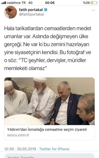AK Parti İstanbul Büyükşehir Belediye Başkan Adayı Binali Yıldırım'ın yaptığı ziyareti diline dolayan Portakal, "Hala tarikatlardan cemaatlerden medet umanlar var. Aslında değişmeyen ülke gerçeği. Ne var ki bu zemini hazırlayan yine siyasetçinin kendisi. Bu fotoğraf ve o söz: "TC şeyhler, dervişler, müridler memleketi olamaz" ifadelerini kullanarak haddini aştı.