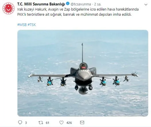 Milli Savunma Bakanlığının Twitter hesabından yapılan bilgilendirmeye göre, Hakurk, Avaşin Basyan ve Zap bölgelerine hava harekatları düzenlendi.