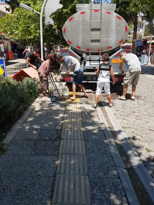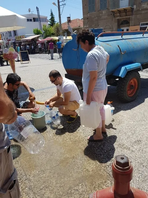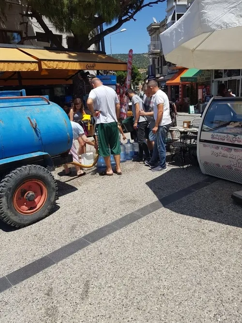 Foça'da yaklaşık 2 gündür sular akmıyor. Belediyeler tankerlerle su dağıtıyor, tankerlerin önünde ellerinde kap ve bidonlarla bekleyen vatandaşlar uzun kuyruklar oluşturdu.