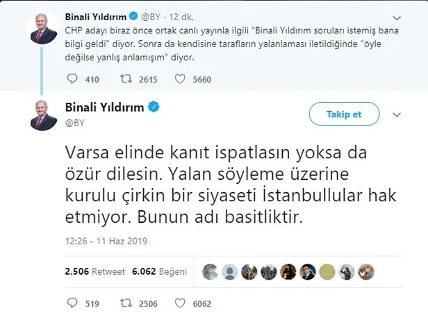 Cumhur İttifakı adayı Binali Yıldırım, CHP'nin adayı Ekrem İmamoğlu'nun katıldığı canlı yayında 'Binali Yıldırım soruları istemiş bana bilgi geldi' iddiasına sosyal medya hesabından cevap verdi. Yıldırım, "Varsa elinde kanıt ispatlasın yoksa da özür dilesin. Yalan söyleme üzerine kurulu çirkin bir siyaseti İstanbullular hak etmiyor. Bunun adı basitliktir." dedi. Skandal iddia üzerine canlı yayına bağlanan İsmail Küçükkaya, kendisinden soruların talep edilmediğini söyledi. Böylece İmamoğlu'nun yalanı bir kez daha elinde patladı...