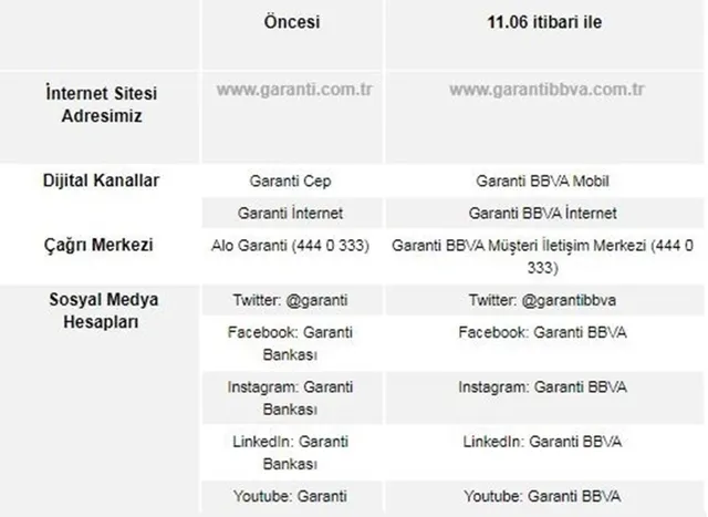 "9 yıldır bünyesinde bulunduğumuz BBVA Grubu'nun tüm dünyada uyguladığı dijital dönüşüm stratejisi kapsamında, BBVA'nın global marka gücünü Garanti marka ve logosunun yanına ekliyor ve 11 Haziran'dan itibaren Garanti BBVA ismini kullanmaya başlıyoruz.