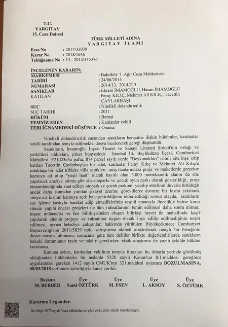 Karara; Feray Kılıç, Mehmet Ali Kılıç ve Taceettin Çaylarbaşı isimli müştekiler avukatları aracılığı ile itiraz etti. Hukuk savaşı veren mağdurlar geçtiğimiz aylarda Yargıtay'dan gelen bozma kararı ile sevindi. Yargıtay, İmar planlarında, "Yeşil bant" olarak kayıtlı yeri kendi projesine aitmiş gibi gösteren, daha sonra burayı sitenin otoparkına dönüştüren 'İmamoğlu İnşaat' isimli şirketlerin sahibi Ekrem İmamoğlu ile babası Hasan İmamoğlu "Nitelikli dolandırıcılık" suçlamasıyla yerel mahkemeden alınan beraat kararını bozdu ve yeniden yargılanmalarına karar verdi.