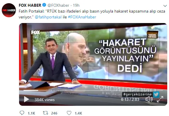 AK Parti karşıtı manipülatif haberleriyle bilinen FOX TV'nin sunucusu Fatih Portakal, CHP adayı İmamoğlu'nun Ordu Valisi'ne hakaretine ilişkin "Görüntüler var. Kulaklarımın ne duyduğunu ben biliyorum" demesine rağmen görüntüleri yayınlamadı. İmamoğlu'nun hakaretlerini inkar edemeyen Portakal, birçok kanalın yayınladığı görüntüleri "RTÜK cezası" yalanına sarılarak yayınlamadı ve CHP adayına kalkan oldu.