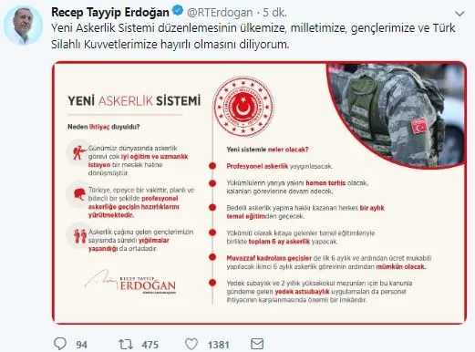 Twitter hesabından yeni askerlik sistemiyle ilgili paylaşım yapan Başkan Recep Tayyip Erdoğan, "Yeni Askerlik Sistemi düzenlemesinin ülkemize, milletimize, gençlerimize ve Türk Silahlı Kuvvetlerimize hayırlı olmasını diliyorum." diye yazdı.