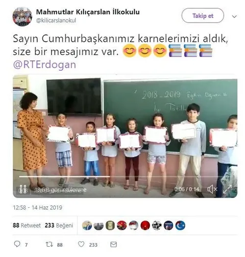 Alanya'daki Mahmutlar Kılıçarslan İlkokulu'nda öğrenim gören öğrenciler Başkan Recep Tayyip Erdoğan'a Twitter üzerinden "Sayın Cumhurbaşkanımız karnelerimizi aldık, size bir mesajımız var." notuyla videolu mesaj gönderdi. Öğrencilere Başkan Erdoğan'dan yanıt gecikmedi.