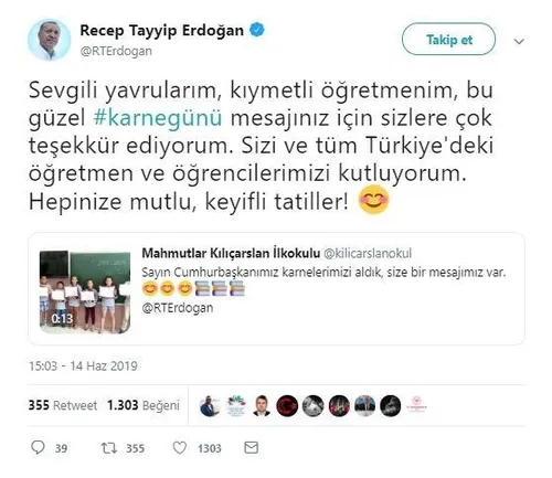 Başkan Recep Tayyip Erdoğan, Twitter'da "Sayın Cumhurbaşkanımız karnelerimizi aldık, size bir mesajımız var." yazarak videolu karne günü mesajı gönderen Mahmutlar Kılıçarslan İlkokulu öğrencilerine yanıt verdi. Başkan Erdoğan, "Sevgili yavrularım, kıymetli öğretmenim, bu güzel karne günü mesajınız için sizlere çok teşekkür ediyorum. Sizi ve tüm Türkiye'deki öğretmen ve öğrencilerimizi kutluyorum. Hepinize mutlu, keyifli tatiller!" ifadelerini kullandı.