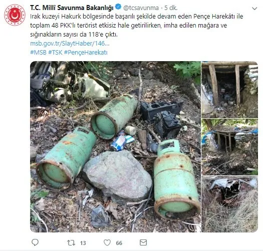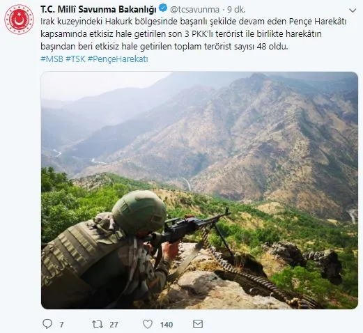 Bakanlığın Twitter hesabından yapılan açıklamada, "Irak kuzeyindeki Hakurk bölgesinde başarılı şekilde devam eden Pençe Harekâtı kapsamında etkisiz hale getirilen son 3 PKK'lı terörist ile birlikte harekâtın başından beri etkisiz hale getirilen toplam terörist sayısı 48 oldu" denildi.