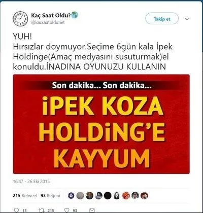 ‘Kaç Saat Oldu?’ isimli FETÖ hesabının yöneticisi olduğu iddiasıyla gözaltına alınan E.B. ilginç itiraflarda bulundu. E.B. hesabı Birgün Gazetesi eski yöneticisi ve yazarı Barış İnce’ye devrettiğini iddia etti. Hakkında soruşturma başlatılan Barış İnce’nin bir süre önce Türkiye’yi terkettiği, Almanya’ya firar ettiği anlaşıldı. Hesabın Almanya’da bulunan Barış İnce tarafından yönetildiği değerlendiriliyor.