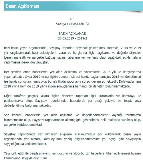 Bazı basın yayın organlarında, Sayıştay Raporları dayanak gösterilmek suretiyle, 2014 ve 2019 yılı karşılaştırılarak bazı belediyelerin zarar ve borçlarına ilişkin açıklama ve değerlendirmeler içeren maksatlı ve gerçekle bağdaşmayan haberlere yer verilmiş olup, aşağıdaki açıklamaların yapılmasına gerek duyulmuştur.