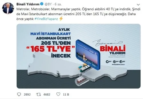 Binali Yıldırım, sosyal medya hesabı Twitter'dan yaptığı açıklamada, Mavi İstanbulkart abonman ücretini 205 TL'den 165 TL'ye düşürüleceğini duyurdu.