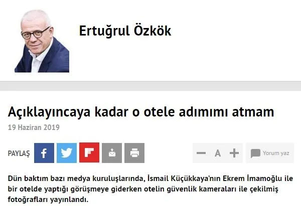 Her fırsatta AK Parti ve Erdoğan'a saldırmaktan geri durmayan bazı yazarlar, söz konusu CHP adayı İmamoğlu olunca başını kuma gömdü. Yazar Ertuğrul Özkök, CHP adayı İmamoğlu ile yayın öncesi buluşup soruları paylaşan moderatör İsmail Küçükkaya'ya tek söz etmezken eleştiri oklarını buluşmanın gerçekleştiği otele çevirmeyi tercih etti.