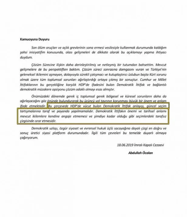 Bugün avukatlar ellerindeki mektubu yayınlamak durumunda kaldı. Abdullah Öcalan'ın seçime ilişkin kararını ilettiği mektupta HDP'nin tarafsız kalması gerektiği yazıyor.