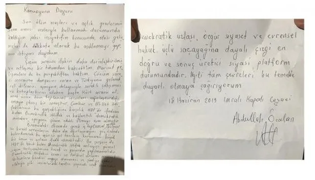 Terörist başı Abdullah Öcalan'ın mektubu gündeme bomba gibi düşerken, mektubu gizlediği söylenen Asrın Hukuk Bürosu'ndaki avukatlar, Öcalan'ın HDP seçmenine 18 Haziran tarihinde yazmış olduğu mektubun ilk halini paylaştı. Abdullah Öcalan'ın seçime ilişkin kararını ilettiği mektupta HDP'nin tarafsız kalması gerektiği yazıyor.