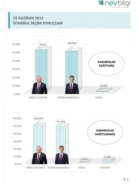 %3,28 kararsız seçmen orantılı bir şekilde dağıtıldığında Binali Yıldırım'ın oy oranı %50,45, CHP adayı İmamoğlu'nun oy oranı ise %48,89 olarak saptandı.