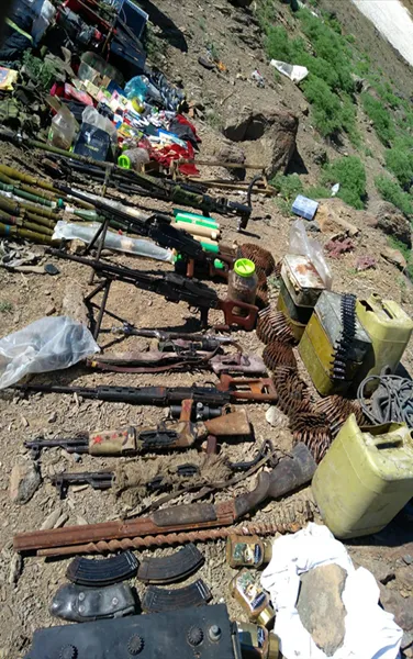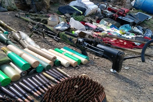 1 adet RPG-7 roketatar, 13 adet anti tank RPG-7 roketatar mühimmatı, 17 adet RPG-7 roket sevk fişeği, 19 adet el bombası, 3700 adet BKC makineli tüfek mühimmatı, 23 adet AK-47 piyade tüfeği şarjörü, 800 adet elektrikli fünye, 12 adet EYP düzeneği, 8 adet kanas keskin nişancı tüfeği şarjörü, 2000 adet AK-47 piyade tüfeği mühimmatı, 1 bidon (5000-6000 adet) doçka uçaksavar mühimmatı, 50 kg amonyum nitrat ve çok sayıda yaşam malzemesi ele geçirildi.