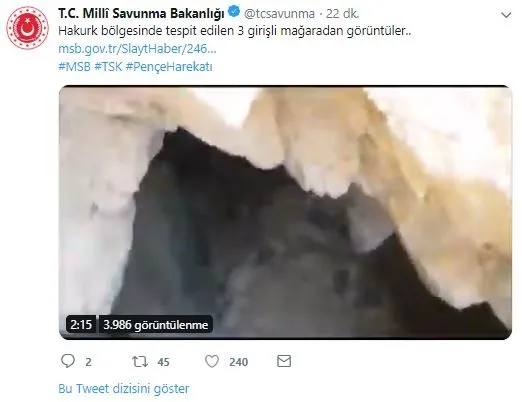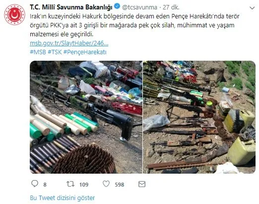 Milli Savunma bakanlığından yapılan açıklamaya göre, son olarak kaya altında toplam 3 farklı girişi bulunan mağara tespit edildi. Mağarada yapılan aramalarda 2 adet AK-47 piyade tüfeği, 1 av tüfeği, 2 adet Kanas keskin nişancı tüfeği dürbünü, 2 adet BKC makineli tüfek, 1 adet Zagros keskin nişancı tüfeği, 1 adet Doçka 12.5 mm sehpalı uçaksavar silahı,
