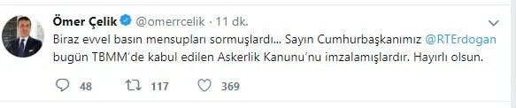 Çelik, "Biraz evvel basın mensupları sormuşlardı... Sayın Cumhurbaşkanımız Recep Tayyip Erdoğan, bugün TBMM'de kabul edilen Askerlik Kanunu'nu imzalamışlardır. Hayırlı olsun." ifadelerini kullandı.