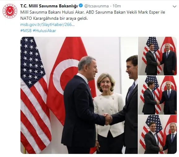 Bakanlıktan yapılan yazılı açıklamada, NATO Savunma Bakanları Toplantısı için Belçika'ya giden Bakan Akar'ın NATO Karargahı'nda ABD Savunma Bakan Vekili Mark Esper ile bir araya geldiği belirtilerek, "Türkiye ve ABD arasındaki diyaloğun sürdürülmesinin önemine değinilen görüşmede, Suriye, F-35 savaş uçağı projesi ile diğer ikili güvenlik ve savunma iş birliği konularında görüş alışverişinde bulunuldu" denildi. Bakan Akar ayrıca, NATO Askerî Komite Başkanı Sir Stuart Peach ve heyetiyle bir toplantı gerçekleştirdi.