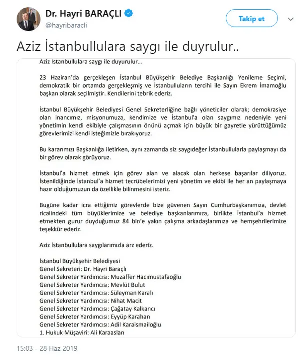 İstanbul Büyükşehir Belediyesi Genel Sekreterliğine bağlı yöneticiler olarak; demokrasiye olan inancımız, misyonumuza, kendimize ve İstanbul'a olan saygımız nedeniyle yeni yönetimin kendi ekibiyle çalışmasının önünü açmak için büyük bir gayretle yürüttüğümüz görevlerimizi kendi isteğimizle bırakıyoruz.