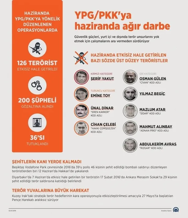 Türkiye'nin barış, huzur ve güvenliğini bozmak için sivilleri, çocukları ve bebekleri dahi hedef almaktan çekinmeyen terör örgütü YPG/PKK'ya yönelik haziranda düzenlenen operasyonlarda aralarında örgütün sözde sorumlularının da bulunduğu çok sayıda terörist etkisiz hale getirilerek örgüte ağır darbe indirildi.