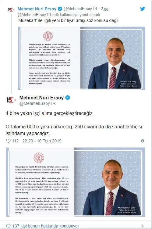Ersoy, "Yerli turisti korumamız gerekiyor. Müze Kartı yaygınlaştırmak istiyoruz. Müze Kart'ın bundan sonra hiçbir zaman fiyatını yükseltmeyeceğiz. Müze Kart fiyatları sabit kalacak, zam yapmayacağız." dedi.