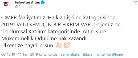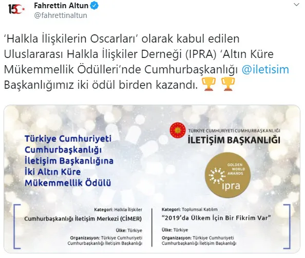 Cumhurbaşkanlığı İletişim Başkanı Fahrettin Altun yaptığı açıklamada, Cumhurbaşkanlığı İletişim Başkanlığı'nın, CİMER ile 'Halkla İlişkiler' kategorisinde, '2019'da Ülkem İçin Bir Fikrim Var' projesinin ise Altın Küre Mükemmellik Ödülü'ne hak kazandığını duyurdu.