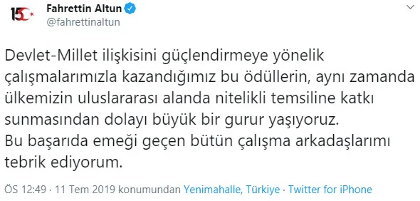 Altun yaptığı açıklamada: 'Devlet-Millet ilişkisini güçlendirmeye yönelik çalışmalarımızla kazandığımız bu ödüllerin, aynı zamanda ülkemizin uluslararası alanda nitelikli temsiline katkı sunmasından dolayı büyük bir gurur yaşıyoruz. Bu başarıda emeği geçen bütün çalışma arkadaşlarımı tebrik ediyorum.' sözlerini kullandı.