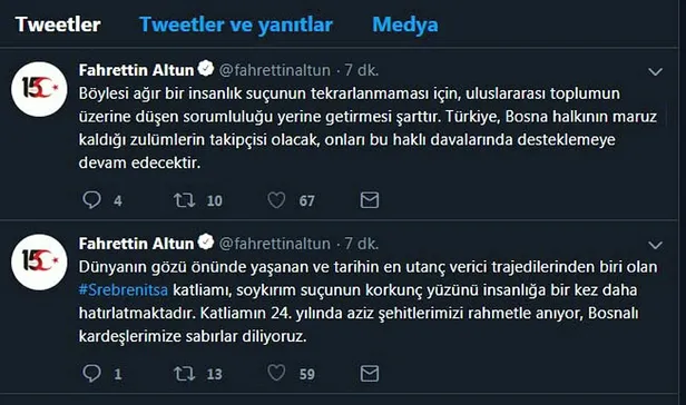 Cumhurbaşkanlığı İletişim Başkanı Fahrettin Altun, 'Srebrenitsa katliamı'nın 24'üncü yıl dönümü nedeniyle Twitter hesabından açıklama yaptı.