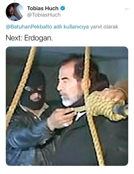 İngiltere'de muhabirlik yaptığı bilinen Tobias Huch adında bir Türkiye düşmanı, sosyal medya hesabından Başkan Erdoğan'ı hedef alan bir paylaşımda bulundu. PKK sempatizanı Huch, Saddam Hüseyin'in idam edildiği fotoğrafı referans göstererek "Sıra Erdoğan'da" dedi. Türkiye'nin son zamanlarda attığı savunma ve enerji alanındaki stratejik adımlar hesaba katıldığında; Türkiye düşmanı Tobias Huch'un bu tutumu gayet net anlaşılabilirken sözde muhalefet adı altında Türkiye'nin çıkarlarını baltalama peşinde olan yazar ve siyasetçiler; bir başka deyişle "içimizdeki Tobiaslar" asıl problem haline geldi.