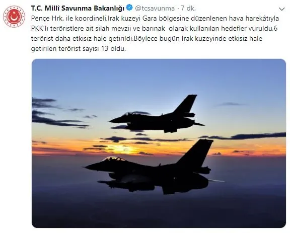Milli Savunma Bakanlığı Twitter üzerinden yaptığı açıklamada, Irak'ın kuzeyindeki Gara bölgesine düzenlenen hava harekatında 6 terörist daha etkisiz hale getirildiğini duyurdu.